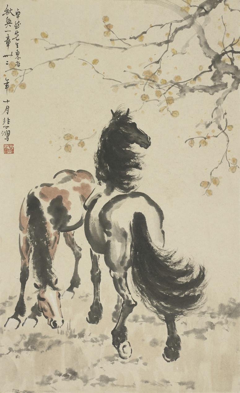 此幅《双骏图》描述了凛冽秋风中,两匹骏马相对而立。画面前方左侧靠后一匹骏马伏首觅食;居于画面正中的黑马,昂首凝视,与左侧靠后骏马相互依靠,结构稳固,构图巧妙而层次分明。浓墨重笔画鬃毛和马尾,率笔勾勒马身和四肢,淡墨渲染,笔墨精湛,形神兼备。画中昂首右视之马形体伟岸,姿态飘逸而不失傲气,鬃毛张扬,似乎有万钧之力,一种威风凛凛的生气顿现眼前,给人以极大的力量和艺术感染力,令人过目难忘。徐悲鸿此画用笔收放自如,实属画马之精品力作。此画是徐悲鸿1943年所作,其时抗日战争正处在最艰苦的时期,他以孤傲不降的立马姿态来表达自己对胜利的渴望和支持。显现了徐悲鸿托物咏志、借马抒怀的艺术理想,以此来表达赤子之心,爱国之情。