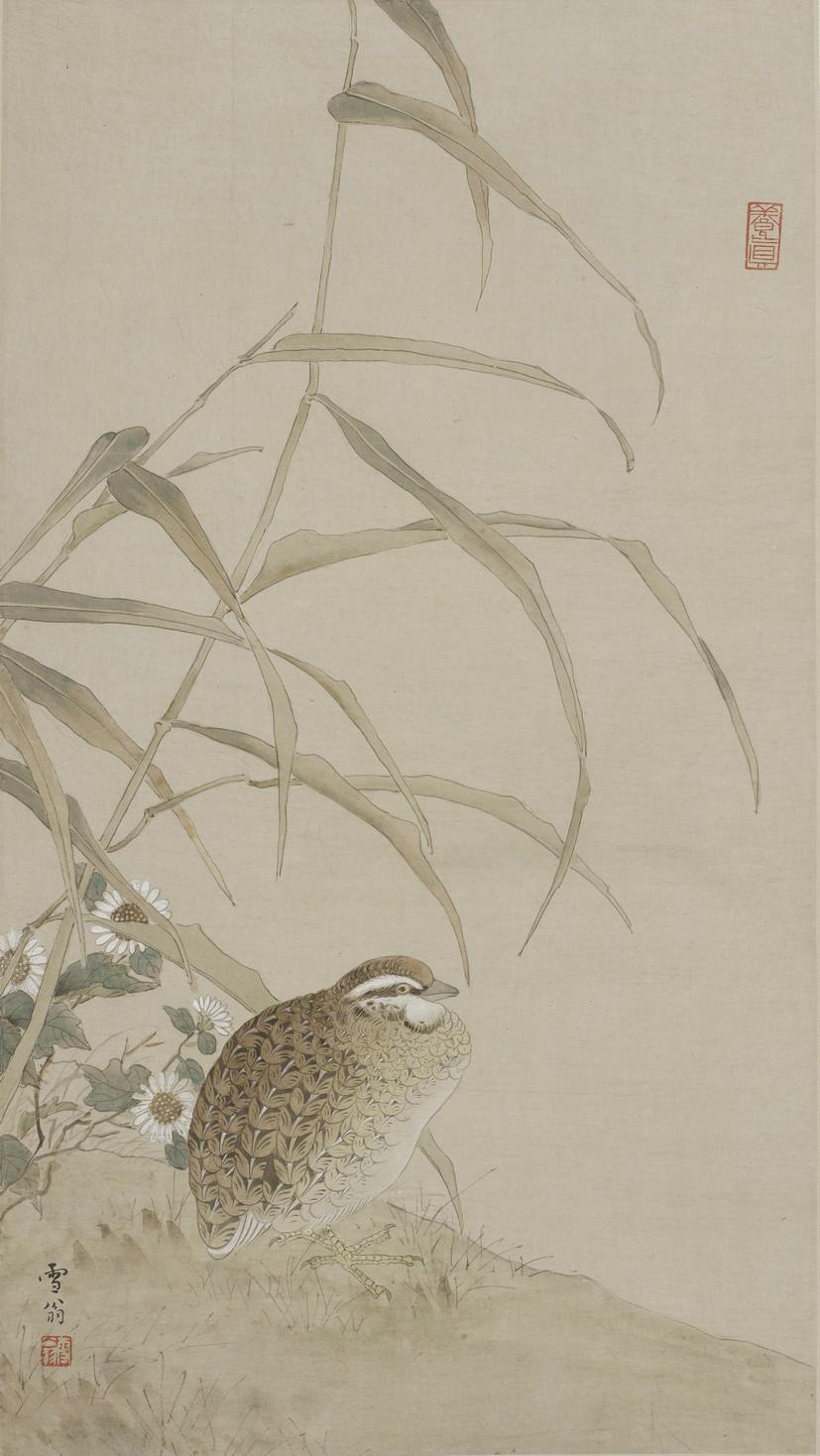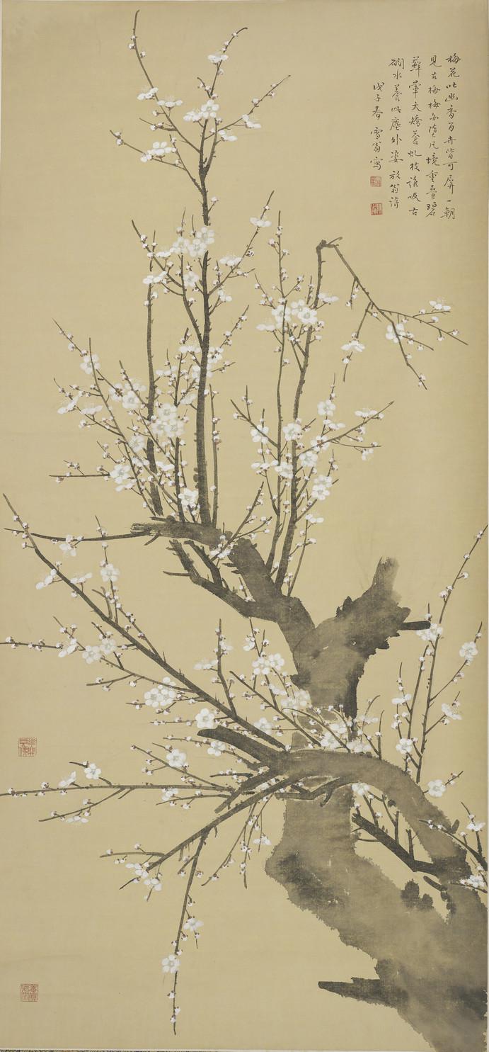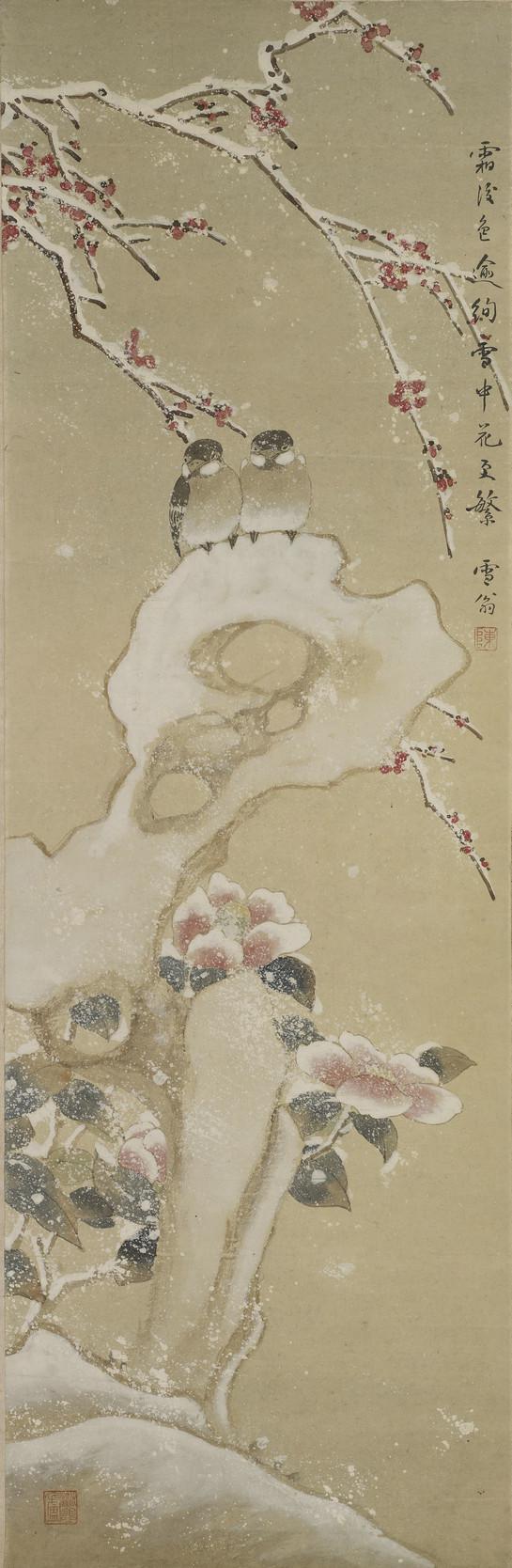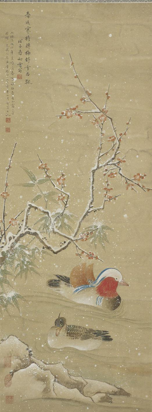 此幅《梅竹双鸳》作于1948年,为陈之佛持赠五十年代江苏省卫生厅领导张克威同志之作。画面笔法兼工带写,背景穿插着几枝疏朗的红梅,树上的积雪和漫天飘舞的雪花,充满着夜空的寒意。树下一对鸳鸯结伴游于岸边,安详静谧,意境幽远,深刻地表达出“浓香残月玲珑影”的动人诗意,肃杀中透出淡淡的春消息。画面清政高标,神接宋人,无一丝烟火之气。