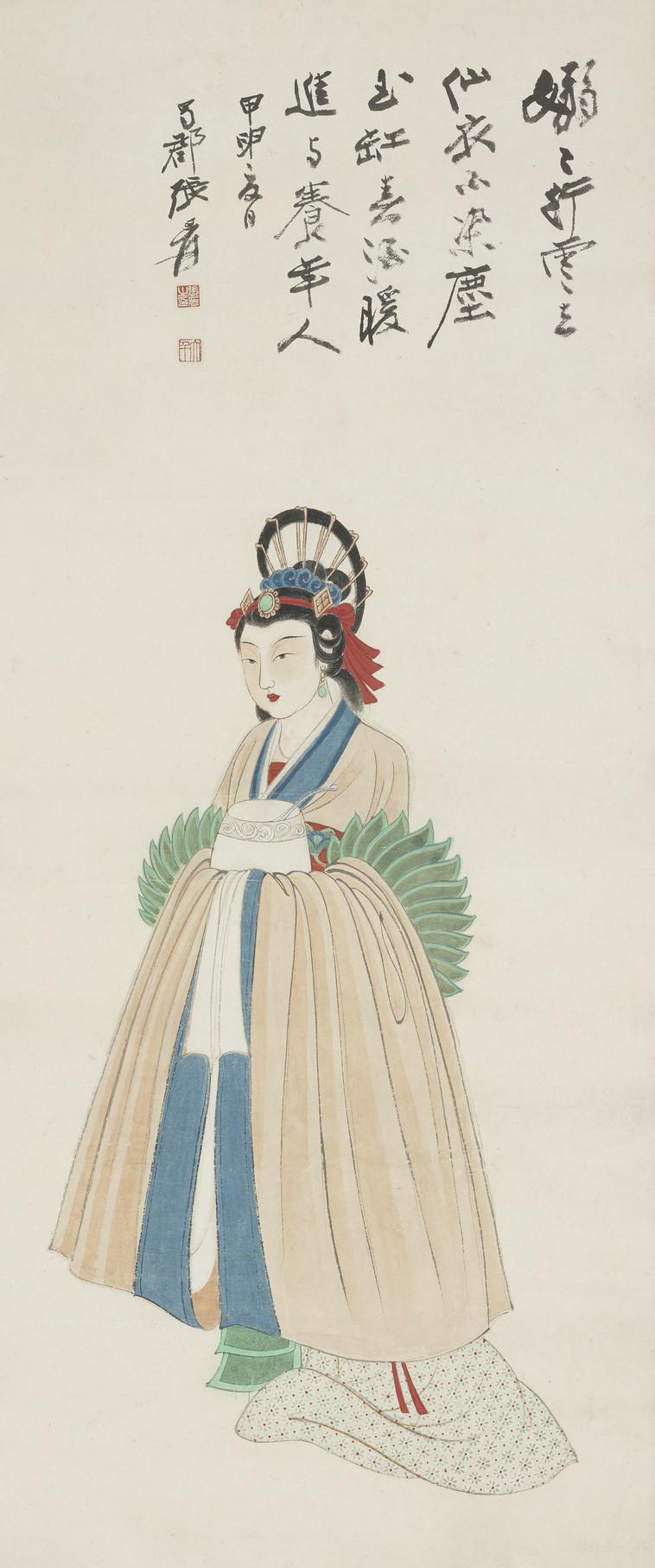 这件创作于1944年的《仙女献酒图》就是张大千敦煌归来后新仕女形象的典型代表。画中仕女丰润甜美,华贵异常。她头髻高悬,广袖披帛,着对衿裙襦,双手和握于胸前,雍容高雅,其头饰与服饰是典型的敦煌唐代壁画中的天女形象,充分体现出“袅袅行云去,仙衣不染尘”的天女形象。在用笔上,张大千运用唐人渊穆醇厚的“莼菜描”及“高古游丝描”对人物进行细致刻画,从头髻发饰到肌肤眉目及衣饰花纹,线条无不潇洒灵动,劲健流畅,达到院体式细节描绘与白描式勾勒的最佳结合。设色敷彩也放弃了明清所惯用的清丽淡雅而改为唐代盛行的浓艳华丽,以矿物质颜料石青、石绿、朱砂为主,画面色泽鲜丽而不失高雅,充分地发挥了颜料的高彩度特质。
