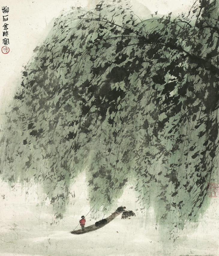 《春风杨柳万千条》根据毛主席词意而作。湖面之上,树冠蓊郁;垂柳倒影在湖面上,郁郁葱葱;安静、空旷却又生机勃勃。巨大的垂柳以石青铺底色,再以狂放的笔墨纵横涂抹,层次明晰。整个画面杨柳迎风舞动腰枝,水面上波光粼粼,一片春光乍泄的景象,将江南水乡美丽迷人的景象展露的惟妙惟肖。一艘小船停在垂柳下倒影中,撑蒿者衣着的一点红色与印章的红,成为整体冷色调中的点缀,使画面活跃、色彩和谐的同时,又点出题材的政治意图。