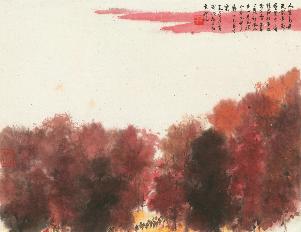 《重阳诗意图》是傅抱石晚期的典藏集作品,亦为其艺术生涯最为重要的作品之一,作品取材于深秋时节的金陵,险奇的构图,大胆的用色,即深沉厚重,又饱含对新的时代和生活的歌颂。显示出傅抱石惊人的创作能力。万红丛中点点绿影,又有革命的象征意义,在那个特殊的年代里,抱石先生的红色题材,从一个侧面展示时代的脉搏和作者的思想、感情的反映。时代变了,生活感情也跟着变了,通过新的生活感受,不能不要求在原有的笔墨技法的基础之上,大胆地赋以新的生活,大胆的寻找新的形式技法,使我们的笔墨能够有力地表达对新的时代、新的生活的歌颂与热爱。