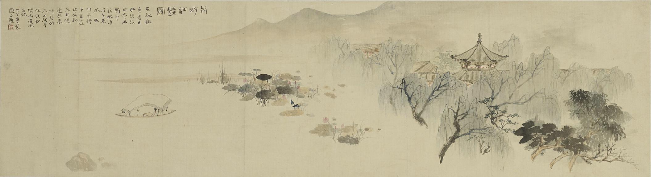 《昆明泛艳图》乃画家应曹靖陶之请,写曹氏与京剧名伶新艳秋泛舟颐和园的一段往事。上款中「靖陶」即曹熙宇,著名诗人、戏剧评论家;而新艳秋乃京剧名旦,曾拜王瑶卿、梅兰芳为师,三十年代初于剧界风头甚劲。从曹氏其他画作可知二人相识于1927年前后,时新艳秋已出人头地,然不识字,靖陶收其为徒,取字「凝绿」,室名「凝绿馆」。从本卷大千末署年款及靖陶首次自题视之,《昆明泛艳图》或作于癸酉五月(1933年),惜其时曹、新二人情缘已逝,令人惋惜。「昆明艳泛」定题后,靖陶即遍邀海内外诗坛耆老、一时名流唱和,卷后共汇集廿七位名家题跋。各家采用之诗笺花色各异,相互争鸣。本卷或于1947年装池完毕,以散原开始,以曹氏与新艳秋一笺殿后。靖陶于卷中遍录各家为凝绿馆主所作诗,其对新艳秋一片深情挂念,尽浓缩此一卷。