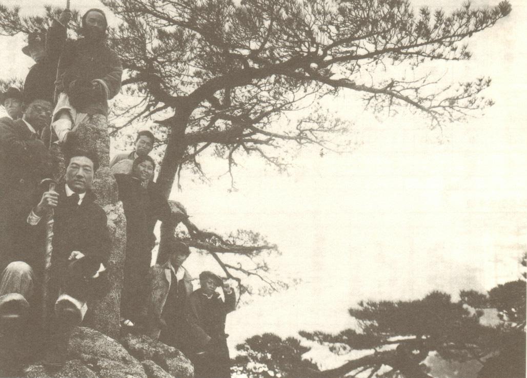 1936年国立中央大学艺术系师生在黄山采风、写生,徐悲鸿(前坐者)、张大千(高处蓄大胡子者)