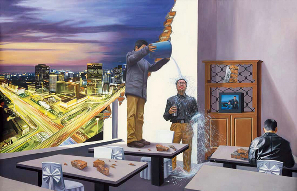 隨著經濟社會的發展,人們經曆了視覺和心理上急劇的變化,從而出現了由文化沖突而引起的混亂所導致的複雜社會現象。而“他們”的作品就是由這樣的社會性背景而產生的。作品裏以室內和室外所造成的鮮明對比,來系列性的描述出當今現實社會和現代人的心理。創作於2006年的《他們--北京CBD》正是這一類作品的典型代表,是“他們藝術小組”在繪畫技術和觀念上成熟的體現。