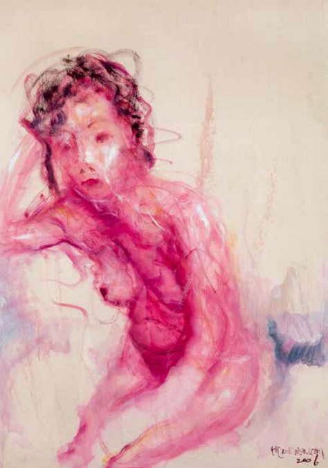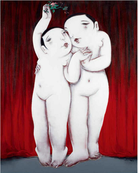 渾圓的身形、微微變形的可愛五官、惺忪的眼神,慵懶隨性的姿態,這就是賈剛繪畫中的人物。這形象中明顯有中國唐代仕女的影子,她們豐潤、嬌憨,慵懶自在的神情中掩飾不住內心的淡淡傷感。 賈剛塑造的人物傳達著普遍生活中人的情感與欲望:輕松快樂、痛苦憂傷、虛無迷惘、沉醉幻想、溫情纏綿、平等和諧……仿佛避開了現實世界的幹擾,處身於另一個容易快樂也容易滿足的國度。