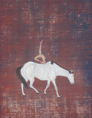 阿海画中的人物要么是裸体,要么穿一件充满褶皱感的白色长袍。要么是光头,要么戴上一顶圆顶帽子。他们面孔模糊,目光呆滞,没有欲望,呆立在画面的某个局部。人们难以确定这个人物的身份:既像是古人,也像是当代人;既像是现实中人,也像是幻觉中人。因为画面本身的超现实场景,这也像是一个不真实的人,一个梦中人。绘画的场景看上去像是一个梦幻场景。它们并不遵循现实的逻辑:一个人和一匹马(一只鹅)在一起,和一朵花在一起,甚至和另外一个人在一起。但是,它们并没有在一起的逻辑根源。无论是事件的逻辑根源,还是时空的逻辑根源。它们有一种画面结构上的关系,但是,没有现实的实践关系,没有故事情节的关系。它们各自为政,各自有自己的地盘。画面的各要素之间存在着距离:既是画面上的空间距离,也是二者之间的心里距离。它们跻身在同一张画面上,但却彼此有一种强烈的疏远感。它们都看不到对方。它们的目光并不相遇。如果说画面上出现了人、动物(马或者鹅)和植物(花)这三种类型的生命形式的话,那么,这三种生命形式各不相关。人和人的目光不交织,马和人的目光不交织,花既不是为人也不是为马而开放的,这是一朵孤独之花,正如人是孤独之人,马是孤独之马一样。马不是用来骑的(阿海甚至诙谐地说,他画的是中性的马),人也不是骑手,它们各自沉浸在自己的世界中,沉浸在自身的内在性中而不跨出自己的地盘。