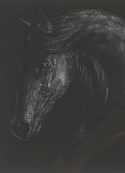 关于马,它们在我的作品里只是一个喻体而已,我拉近了视觉空间的距离就是为了用它们来表现人的情感与精神,“马的肖像”就是“人的肖像”,我大多画的都是静态的马,并将他们置于黑暗中,置于强烈的对比光线下,‍就是为了处理和展现情感的细节,我把我的内心藏在马的眼神里、涌动着热血的血管里、像尖刀一样竖立的耳朵里、膨胀紧张的肌肉里,它代表了我对人本身以及人之间情感的理解,也代表了我对自由和光明的渴望,马是一种特殊的动物,它总让我想到低谷中向上的奋进、困顿时渴望的奔腾、暗夜里等待的黎明、归来后孤独的英雄。马除了本体的优点还拥有很多被赋予的文化属性,所以我内心里的很多感受总是能很顺畅的通过它表现出来。