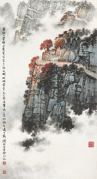 此幅《黄洋界·高路入云端》,钱松喦以超常的思维,非凡的想象,俯瞰的视角,对黄洋界的云海、群峰、松石、栈道等特殊景观给以精确的描绘。画家在画面下方留出大块空白,运用烘云法留空为云,并用水墨及色烘染,无画处有画,反虚为实,表现出云海;接着在中部用逆笔中锋精心勾画出雄伟陡峭的山体,环环相扣,借底部云海来衬托出黄洋界山势险峻,雄伟峭拔。远景的群峰,掩映在云海中,蜿蜒陡峭的栈道环绕在半山腰,点出创作主题“高路入云端”。画面的正中心为本幅绘画“气眼”之所在,基本色调为红色,这种“红”是以赭石、硃磦甚至藤黄,干湿交替,层层积染而成,异常分明厚重;如同战士的鲜血染红了山头,象征着当年的战争异常残烈。