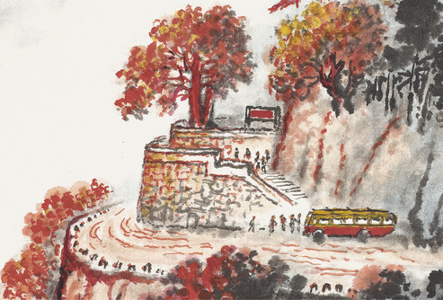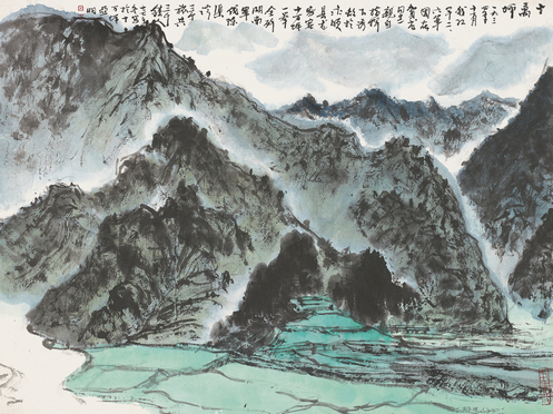 这幅《黄洋界·高路入云端》,是钱松嵒不可多得的一幅精品,画面构图雄伟,山体伟然卓立,用笔用墨纵横飞扬,力感极强,浓墨重彩下,风光愈显朴茂雄秀,云蒸霞蔚,气势非凡,有长枪大戟、错彩镂金之美,充分表现了祖国山川特有的气象魅力,折射出一种积极向上、气势磅礴、大气凛然的精神内涵,充分表达了对革命圣地的无限敬仰和对祖国大好河山的由衷赞美,是革命现实主义与革命浪漫主义高度结合的精品佳作,是时代政治和绘画艺术完美统一的红色经典!这也是一幅打破旧有绘画模式,与时俱进,不断探索创新的划时代的美术典范!