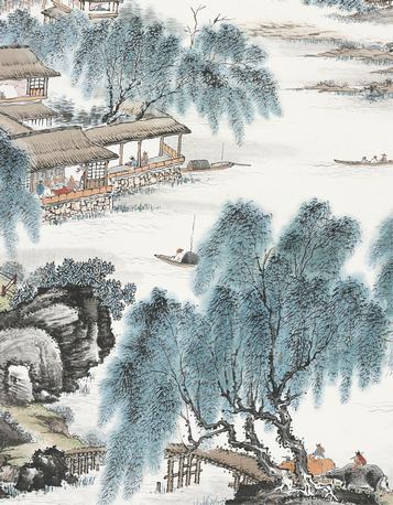 画面内容丰富,烟柳、修竹、苍松、翠柏、险峰、近渚、茅舍、书屋、牧童、隐士、江上渔人、远帆等等。画中近景湖石、烟柳、牧童、小桥具备;中景楼阁掩映在烟柳之中,阁中文人聚会雅谈,钓叟竖杆停舟,凝神静听;湖中高士乘舟游乐,稍远处农田中秧苗青青;远景崇山峻岭,山峦迭嶂,楼阁藏于深山。画家用长披麻皴表现出山石肌理,稍加苔点,使得画中山体繁茂,郁郁葱葱。画面中淡雅别致,通读全画,画家不仅善于学习古人的笔墨技法,空间构图,更为重要的是,在画面中,画家将古代山水画对于丘壑林泉,对于山水的情怀与意趣淋漓尽致的展现了出来,中国古代山水画之以成为中国古代绘画的最高峰,其所代表的精神价值是最为可贵的,赏阅这幅山水画作,我们仿佛看到了先生与古人的对话与交流。