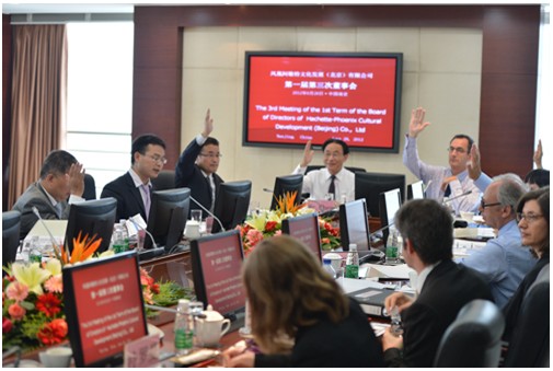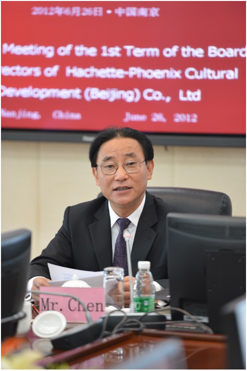 6月26日,凤凰阿歇特文化发展(北京)有限公司第一届第三次董事会在南京凤凰集团总部召开。阿歇特出版集团董事长兼首席执行官阿诺·努里、负责数字化与国际业务的高级副总裁卡特琳娜·居西一行六人,专程从巴黎飞赴南京与会。凤凰集团暨凤凰传媒董事长陈海燕主持会议,凤凰集团副总经理吴小平,凤凰传媒副总经理佘江涛,集团投资部、凤凰传媒国际拓展部、译林社负责人和相关人员出席会议。