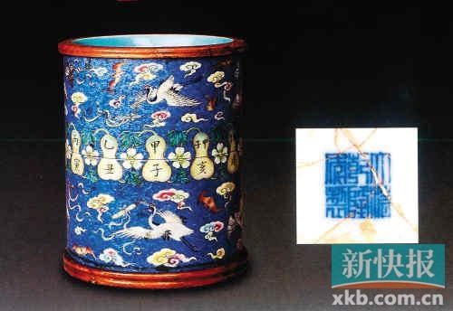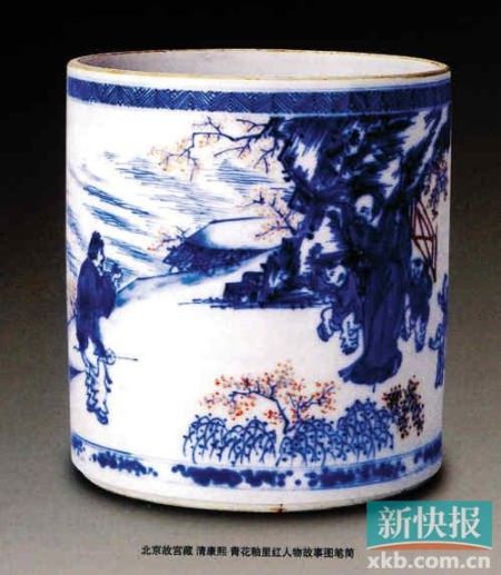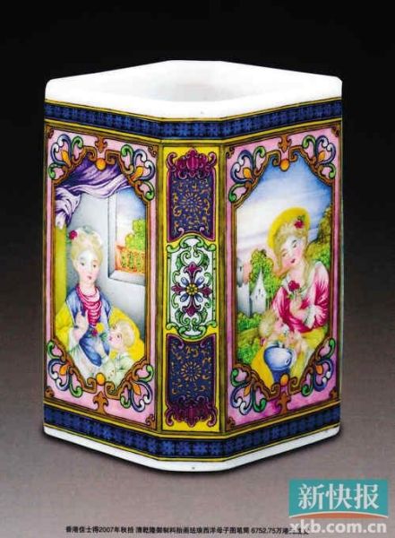 2007年,乾隆御制料胎画珐琅西洋母子图笔筒以6752.75万港元成交。 北京故宫所藏清康熙青花釉里红人物故事图笔筒。