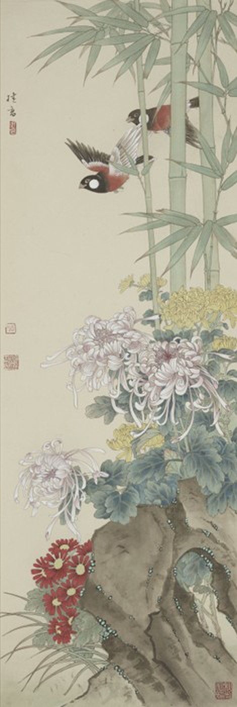 《鸟语花香》,恬静冲淡,俏丽活泼,仿佛能感觉到菊花的暗香浮动、竹叶的窸窣环响和山雀的嘤鸣声,清新气息,融融欲出。