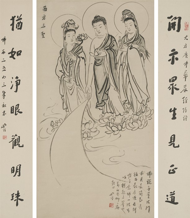 《西方三圣》,描绘的是阿弥陀佛、观世音菩萨和大势至菩萨;线条飘逸而超脱,题款虽无机锋却饱含慈悲,直指人心,真乃高僧大德。圆霖是毫无疑问的南京历史上“清初四画僧”(弘仁、髡残、朱耷、石涛)之后的又一位造诣精深的佛门艺术大师。