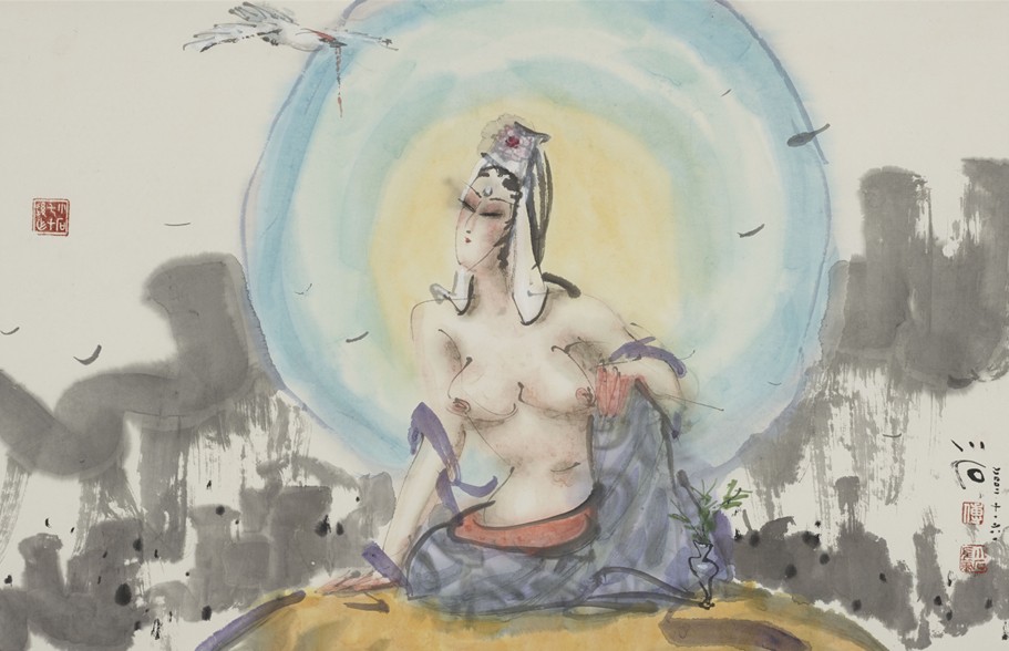 傅小石的《观音》,好是生动,用笔空灵洗练,意境高妙;观音虽以裸身的形象出现,却意外地弱化了宗教的神秘感,平添了几分欢喜。此时,观者眼中无色、心中无欲,顿生神圣不可冒犯的崇敬感。口衔璎珞飞进的小鸟,是圆满的暗示,是作者彻悟的神来之笔。