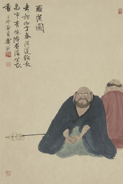 徐乐乐的《罗汉图》中,两个疲倦的云游罗汉席地打坐,法杖曵地,不交一语。正面一个的神情憨态可掬,有些痴,有些呆,心思不可捉摸。整个画面妙趣横生,谐谑并出,作者的巧思真是让人惊叹。