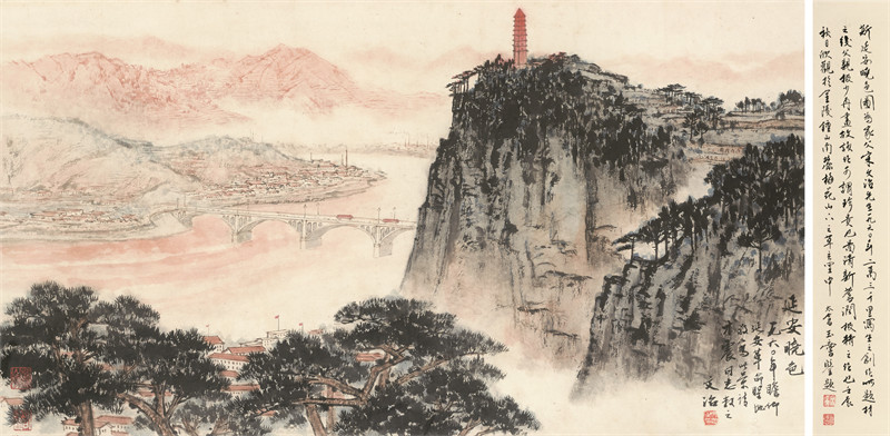 《延安晓色》以圣地风光为表现内容。画面中的宝塔山、延安大桥、延河两岸的房屋、远处的厂房等景物虚实相济,一派热闹的社会主义建设景象,跃然而出。作者将浓墨与浅绛的手法进行艺术的映衬,尤其是云蒸霞蔚的淋漓处理,凸显出红色主题,浑然天成,不着痕迹。