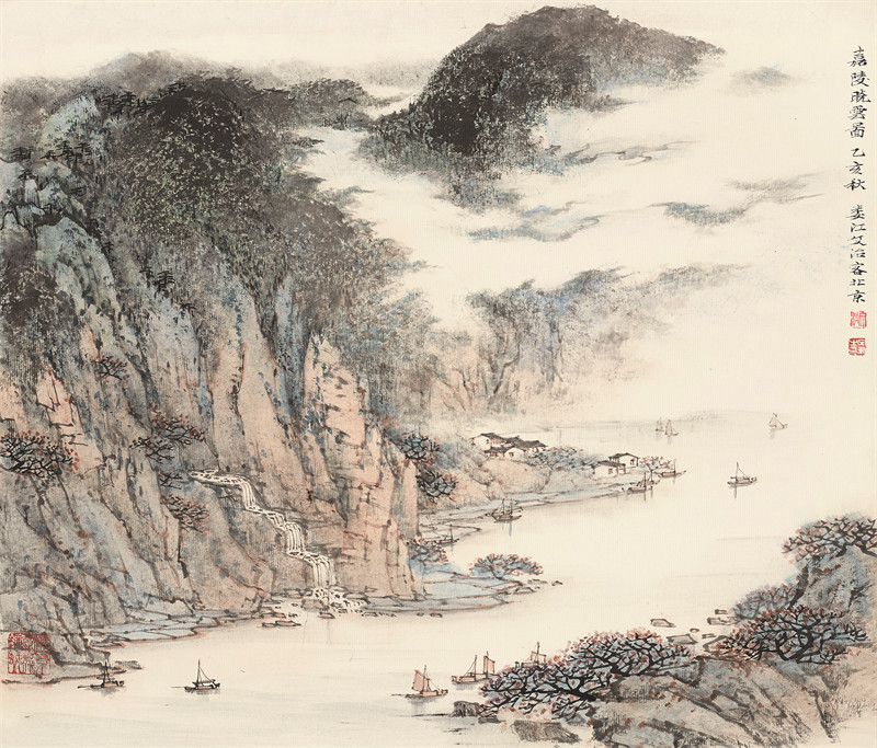 《嘉陵晓云》采用浅绛山水的手法绘制,画面清隽,气韵流动,现实之中古意犹存,可以看出大师深厚的锤炼之功。