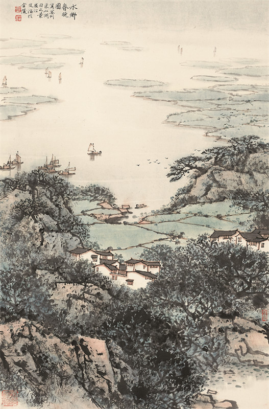 《水乡春晓》以鸟瞰的视角展现出太湖水乡的秀丽=美,而太湖的诗情画意是大师永远魂牵梦绕的心结。仿佛桨声帆影里,飘浮着丝竹的韵律和乌梅的甜意,能不忆江南?