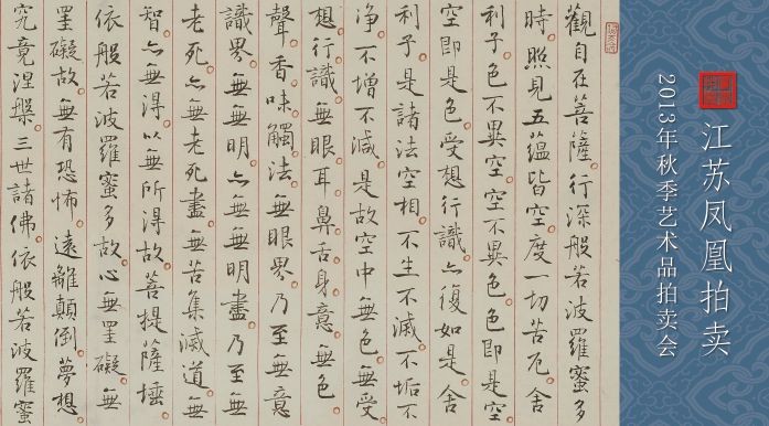 孙晓云的《心经》、杨春华的《观音》和胡宁娜的《普光如意观音》,是江苏凤凰拍卖2013年秋季艺术品拍卖会(12月20—21日预展,22日拍卖,南京丁山花园大酒店钻石厅)《新视觉——中国当代水墨专场》中的佛教题材拍品。