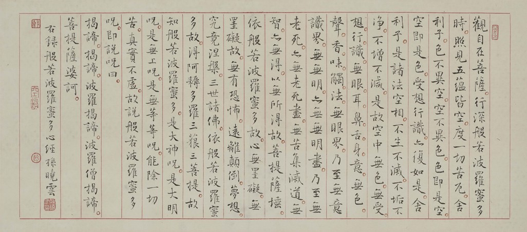 孙晓云的《心经》,抄写的是《般若波罗蜜多心经》(简称心经),为大乘佛教的重要经典之一。红栏格内的小楷,带有几分启功的笔意,清秀雅致,漂亮的要命。
