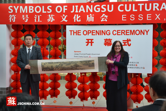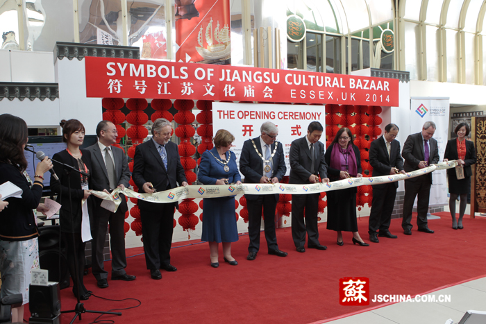 伦敦时间10月18日(北京时间10月19日)由江苏省人民政府和英国埃塞克斯郡政府共同主办,江苏省人民政 府新闻办公室、凤凰出版传媒集团承办的“符号江苏”首届文化庙会,在英国江苏友省埃郡开幕。宜兴紫砂工作坊、南京云锦博物馆、扬州漆器厂、瀚港文化发展公 司、凤凰文贸集团有限公司、凤凰拍卖国际有限公司、凤凰国际文化交流中心、凤凰出版传媒国际(伦敦)总公司等十多家来自中国江苏的知名文化企业参展,英国 当地多家文化企业也参展交流及洽谈合作。埃塞克斯郡副郡长Penny Channer、 埃郡首府切姆斯福德市长Robert Villa、埃塞克斯郡国际部主任皮特·马宁等近200位嘉宾出席开幕式。